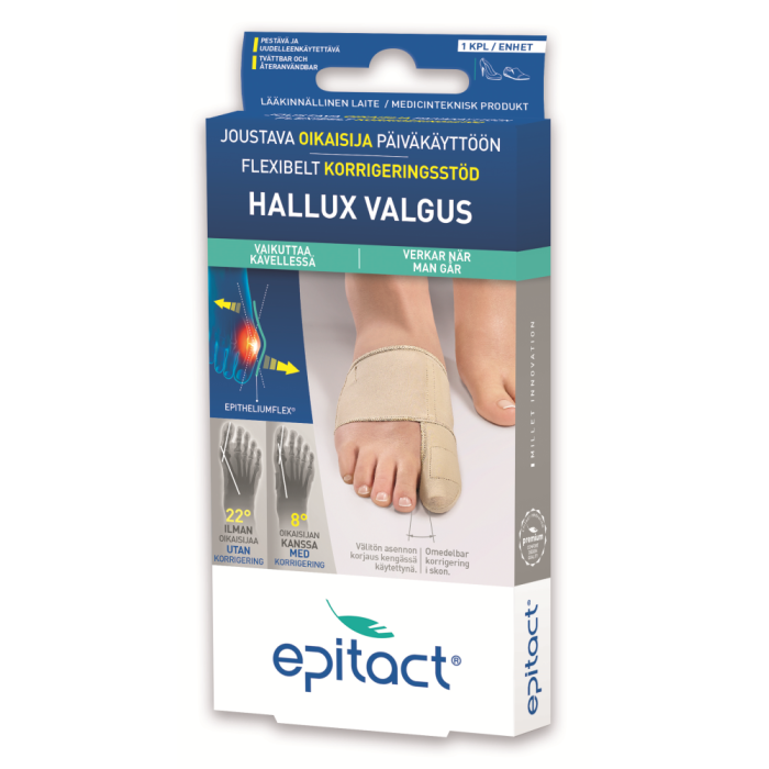 Katso kokotaulukko tuotekuvista. Oikean koon valitsemiseen vaikuttavat kengännumero ja jalkaterän ymärysmitta vaivaisenluun takaa. Voidaan käyttää oikeassa tai vasemmassa jalkaterässä.