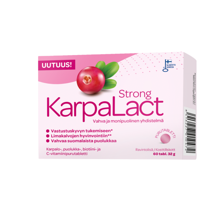 KarpaLact Strong purutabletti sisältää vahvaa karpalouutetta ja runsaasti suomalaista puolukkaa. Karpalo ja puolukka sisältävät luonnostaan tehoaineita, joista tärkeimpiä ovat ns. proantosyanidiinit (PAC). Valmisteen korkea proantosyanidiinipitoisuus, normaalia vastustuskykyä edistävä C-vitamiini ja limakalvojen normaalia hyvinvointia edistävä biotiini muodostavat erinomaisen yhdistelmän kaikenikäisille naisille.